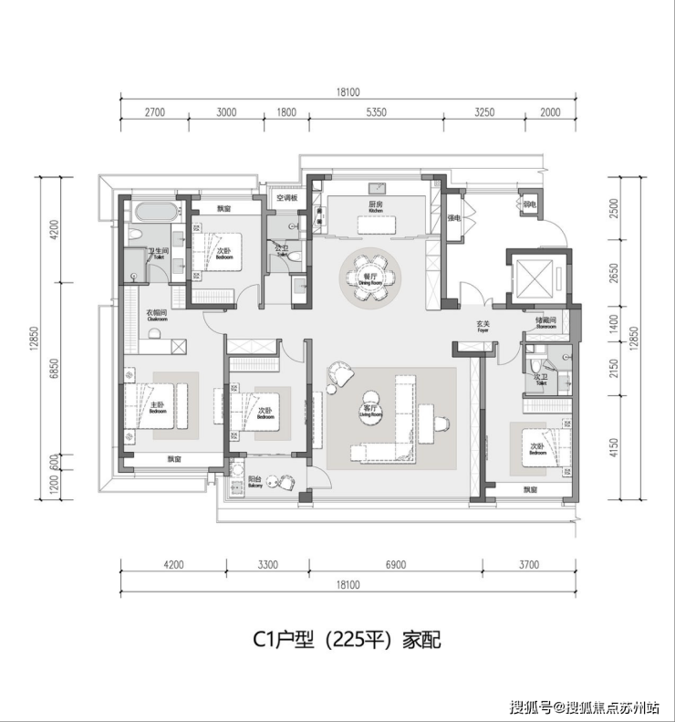 225平方米的户型是项目中的大平层设计,空间感极强。四房三卫的布局,加上宽敞的客厅和餐厅,非常适合三代同堂或者有多个孩子的家庭。主卧不仅面积大,还配有独立的衣帽间和卫生间,居住体验极佳。